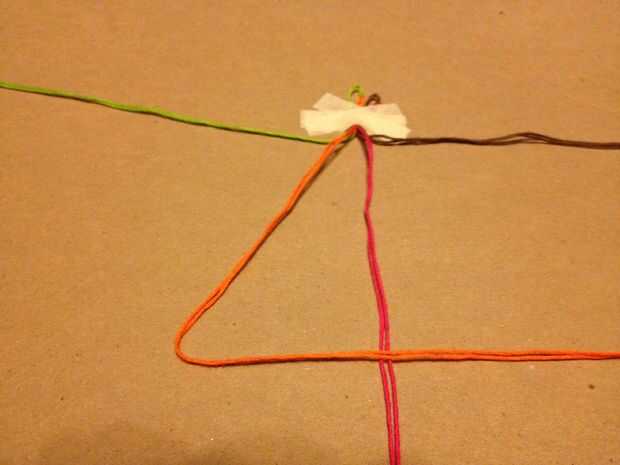 una pulsera bastante sencillo que sólo requiere 1 nudo.  Utilicé 4 colores (1 azul, rojo 2, naranja 3, amarillo 4) pero se puede elegir en cualquier lugar entre 3-8 colores.Materiales que necesitas:-Cadena (a veces llamada seda en tiendas de artesaní