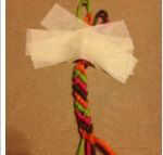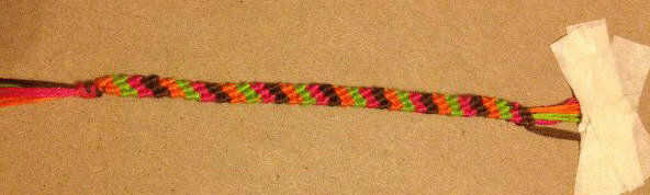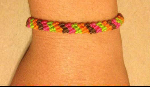 una pulsera bastante sencillo que sólo requiere 1 nudo.  Utilicé 4 colores (1 azul, rojo 2, naranja 3, amarillo 4) pero se puede elegir en cualquier lugar entre 3-8 colores.Materiales que necesitas:-Cadena (a veces llamada seda en tiendas de artesaní