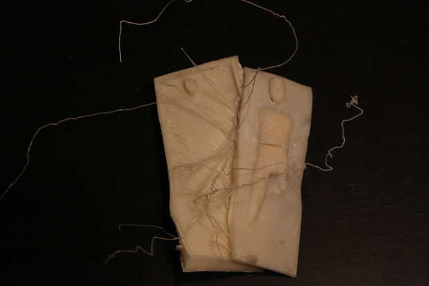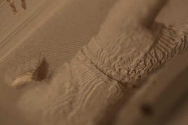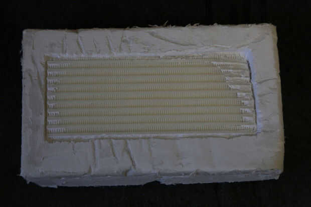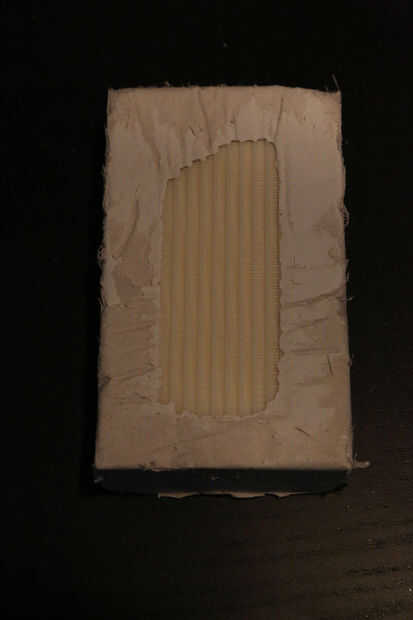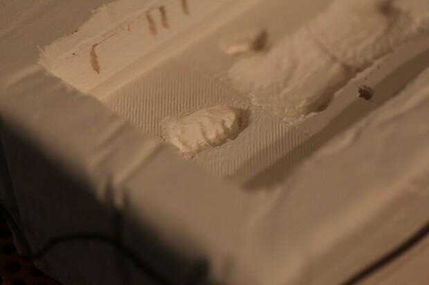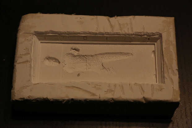 Después de dejar el yeso del molde al aire, necesita extraer con cuidado el molde de la madre del molde de yeso. Para hacer esto usted necesitará primero tallar lejos cualquier yeso extra y luego calentar el material del ABS para que sea flexible. Utilizando una herramienta afilada, cuidadosamente corte en el yeso alrededor de los bordes de su molde. Aquí está lo mío parecía después de este proceso.