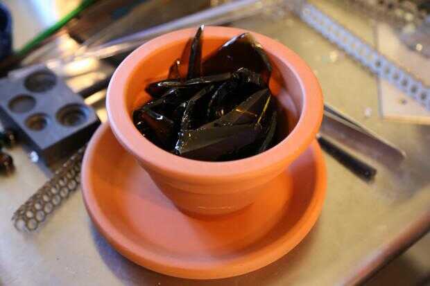 Tienes que romper el cristal en pedazos lo suficientemente pequeños como para caber en la olla de barro que se utiliza para la fusión en el horno. No los hacen tan pequeños que todos caen fuera del agujero antes de que se funden.