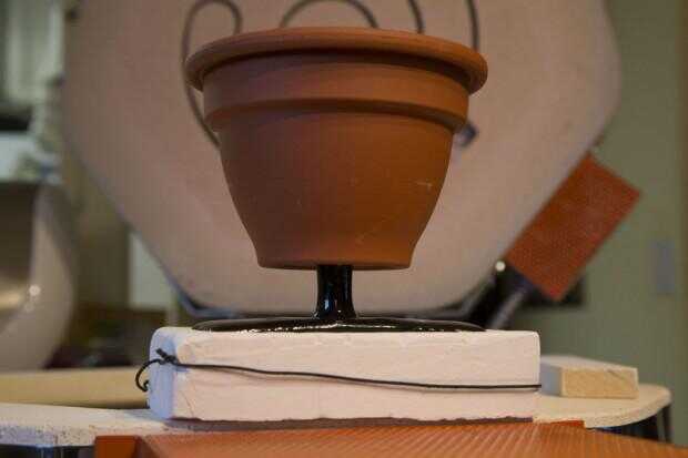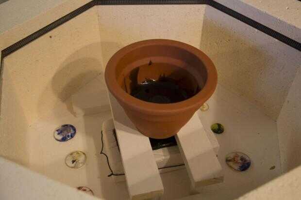 Si tuvo un superávit de vidrio como yo tienes una columna de vidrio colocar el objeto fundido en el crisol de barro. Usé mi tablero de esmeril de diamante a la sierra a través de esta columna para separar la pieza. Debe hacerlo bajo el chorro de agua para lavar hacia abajo las piezas diminutas de vidrio por el desagüe. ¿(Recuerda nuestra vieja pneumonoultramicroscopicsilicovolcanoconiosis amigo? No quieres pedazos microscópicos de cristal flotando libremente en el aire...)