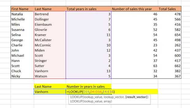 Para la figura anterior, el valor de búsqueda es Vanhorn, el vector de búsqueda es la columna de apellidos, y el vector de resultado es el Total de años en la columna ventas.