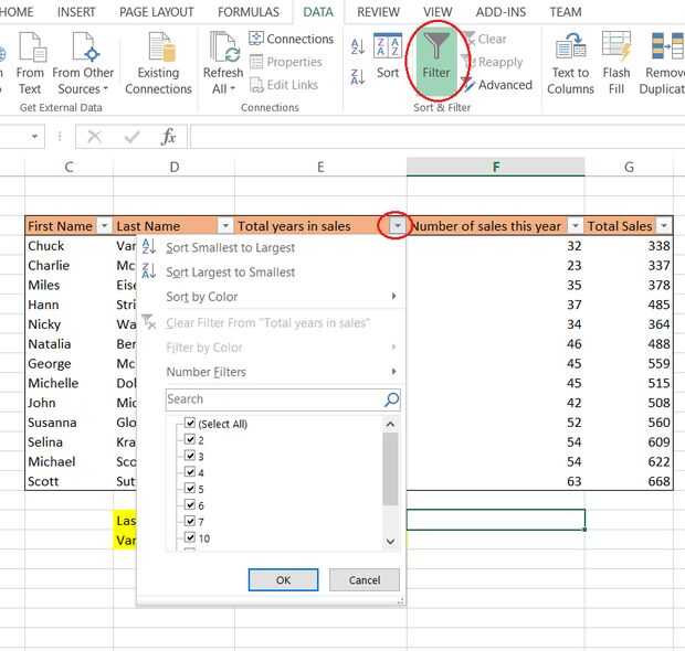 Nota: Los filtros no elimina los datos. Por el contrario, esconden la Fila entera que contiene los datos que se esté filtrando. Si se filtró nombre de Susanna, toda la fila con su nombre, ventas y otra información desaparecería.