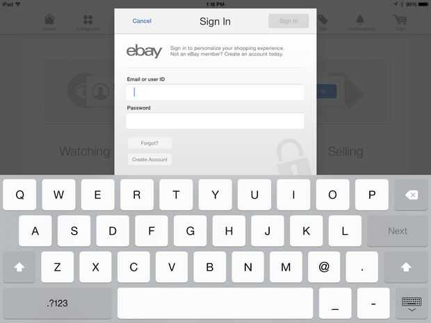 Una vez que ha terminado de descargar la aplicación móvil de eBay necesita lanzar la aplicación y muestra en su cuenta de eBay con su usuario de eBay y contraseña que fue creado en el proceso. (Este tutorial no cubre el proceso de configuración de la cuenta de eBay).