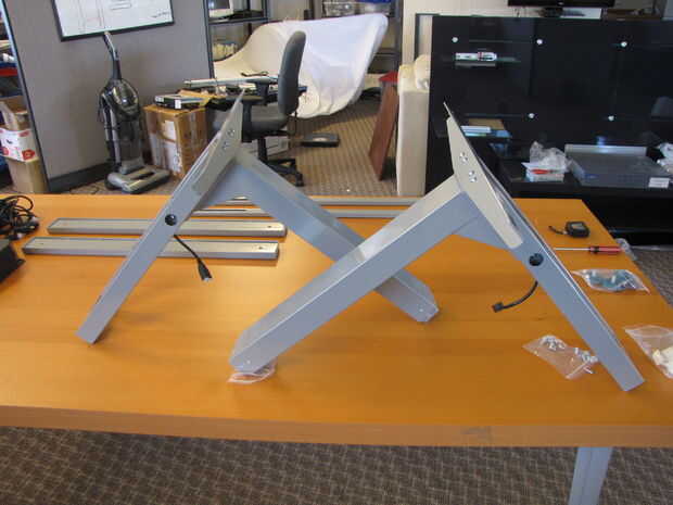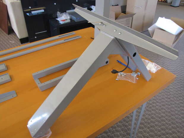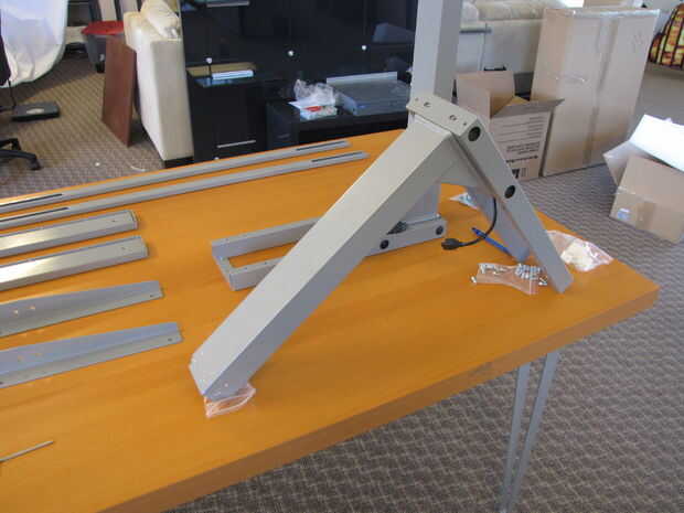 Después de completar las piernas, el siguiente paso es montar los soportes laterales a sus asambleas. Hay solo cuatro pernos de apriete a cada lado. Tenga cuidado de no rayar la superficie de la tabla al hacer esto, se recomienda colocar algo debajo como una toalla o cualquier otra forma; en nuestra construcción de la unidad se puede ver que sólo colocamos la bolsa de plástico vacía que llevó a cabo algunos de los tornillos por debajo de un lado para no rayar nada.