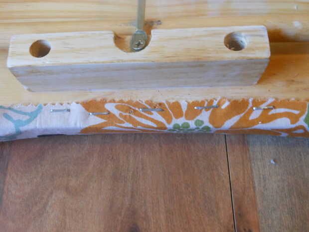Tire la tela hacia arriba firmemente y colocar las grapas a cada lado de la primera grapa del centro.  Repita el proceso en el lado opuesto y luego en los dos extremos.  Aprendí a hacerlo cuando estiraría a un lienzo en placas de soporte, para pintura al óleo.  Mantenga repitiendo; Añadir 2 grapas cada vez, haciendo primero un lado y su lado opuesto.  Este método hará que el material en la parte superior suave de la bandeja y enseñado.