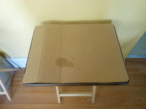 Corte el cartón para que se adaptará a la parte superior de la bandeja sin colgando.  Me preocupaba de estropear la mancha encima de la bandeja mediante la aplicación de calor a través de las 3 capas de guata.  Decidí agregar una capa de cartón para proteger el acabado.