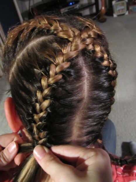 Trenza francesa la sección izquierda inferior, asegurándose de mantener en línea con la parte superior derecha diagonalmente.