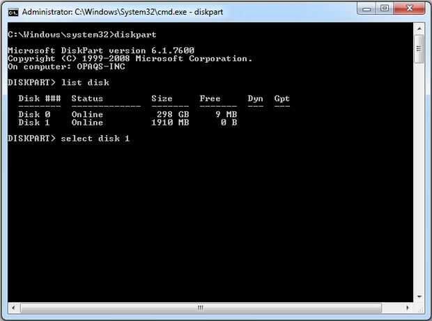 4. Tipo 'Seleccione disco 1' a determinar que el disco 1 se procesarían en el paso siguiente entonces oprimir la tecla Enter.