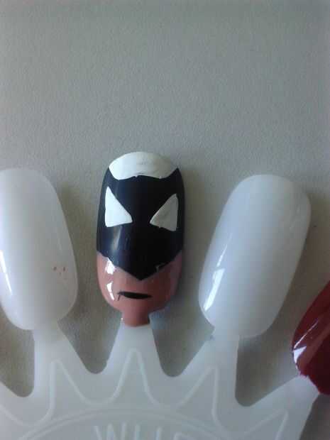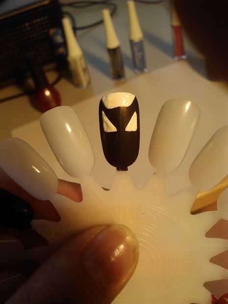 Añadir el blanco en la parte superior de la uña para hacer el look negro como orejas de Batman. también con el esmalte blanco del arte crear sus ojos haciendo dos triángulos de ángulo recto.