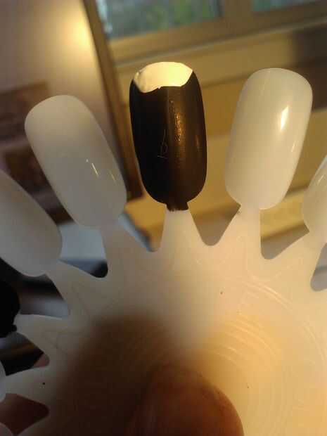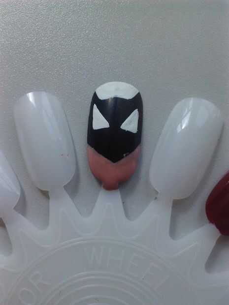 con el marrón de uñas pincel, pintar la parte inferior de la uña, asegúrese de que hay un punto en el centro de la uña, por lo que el negro va a crear la nariz de Batman. después el marrón teñido agregar una pequeña línea negra horizontal para crear Batman boca.