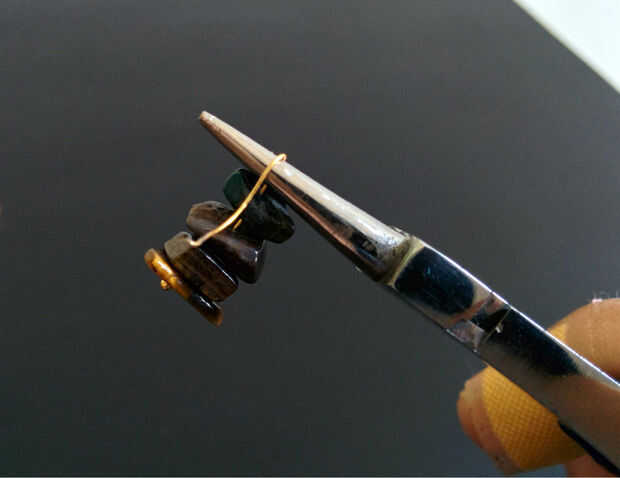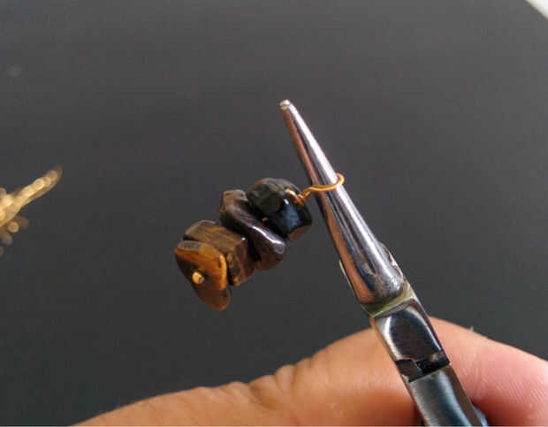 - Enrolle el cable con las manos o los alicates de punta plana alrededor del alambre junto a la última piedra. Esto trabará las virutas de las piedra y hacer un bucle que se utilizará con anillas.
