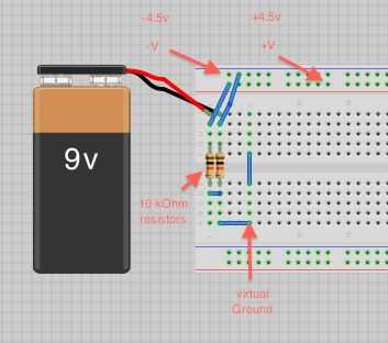 Nota: Para crear un voltaje positivo, utilice la columna roja y tierra virtual. Para crear una tensión negativa, utilice la columna azul y la tierra virtual.