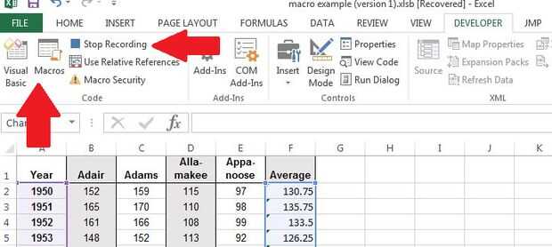La segunda flecha destaca los botones Visual Basic y Macros mencionados anteriormente. El botón visual basic simplemente abrir la ventana VBA y Mostrar código (también puede usar el atajo Alt + F11) sino para mostrar el código de la macro que acaba de grabar o a todas las macros haga clic en el botón de Macros.