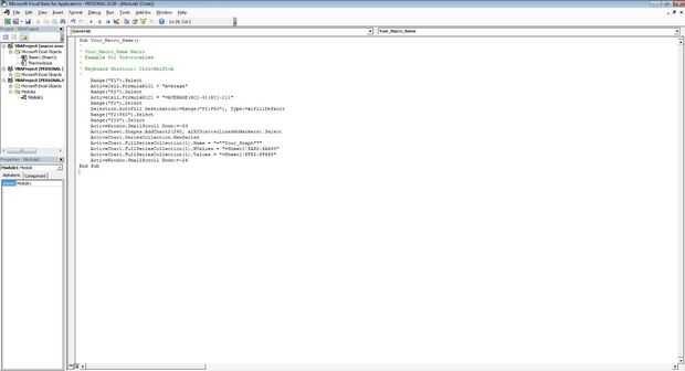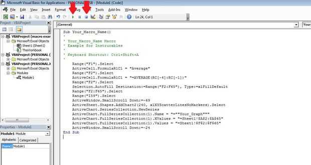 Usted verá una ventana totalmente nueva que se parece a la figura superior, el inferior es ampliada un ejemplo. Esta es la ventana VBA donde puede editar código borrar o escribir código nuevo. Observe los comentarios enumerados en la parte superior de las líneas de código en verde, son el nombre, acceso directo y descripción de la macro que se han definido anteriormente. El código que ve en su pantalla puede ser diferente si hace clic en varias células para desplazarse o si ha seleccionado un gráfico incorrecto, eliminado y añadido otro. Aquí se pueden borrar todas las líneas de código. Es una buena práctica aunque para "comentar" una línea de código agregando un apóstrofo antes de la línea y ejecutar la macro para asegurarse de que todavía funciona como debería. La macro puede ser iniciada y detenida por la flecha verde y la caja azul en la parte superior de la pantalla resaltada por las flechas rojas.