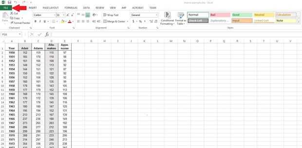 Esta es una vista previa del libro que trabajamos con hoy. Son 65 años de los datos enumerados en 4 condados en Iowa. Media los 4 condados en una nueva columna y ver esa columna en el eje y y los años en el eje x. Tenga en cuenta que estas fotos son de Excel 2013.