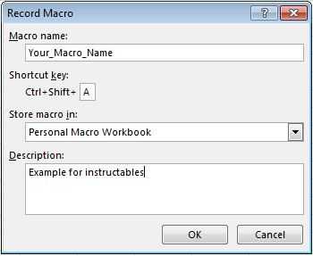 Ya que probablemente se utilizarán esta macro en varios archivos diferentes, guardar en libro de macros Personal. Por último es una descripción que puede ser añadida, pero no tiene que ser. Esto será registrado como comentarios en el código, que se tratarán más adelante. Una vez que todo se ha introducido, haga clic en aceptar