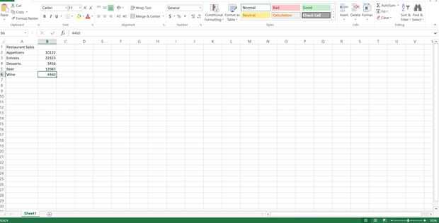 Crear la hoja de cálculo introduciendo los números y etiquetas que se van a utilizar en el gráfico. En este ejemplo, utilicé las etiquetas "Postres", "Appertizers", "Entradas", "Cerveza" y "Vino".
