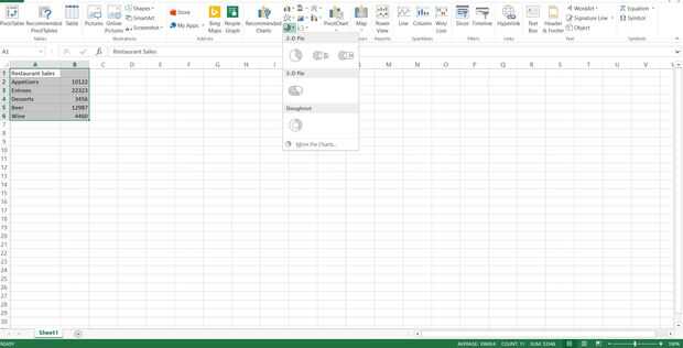 En el grupo "Gráficos", haga clic en el icono de gráfico circular mini y luego aparecerá un menú desplegable con gráficos disponibles.