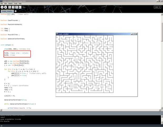 Este código fue convertido por ser de mi código de QBasic DOS antiguo. No está muy optimizado, pero funciona. Establece el tamaño del laberinto con las variables N y M (cuántas filas y columnas.)