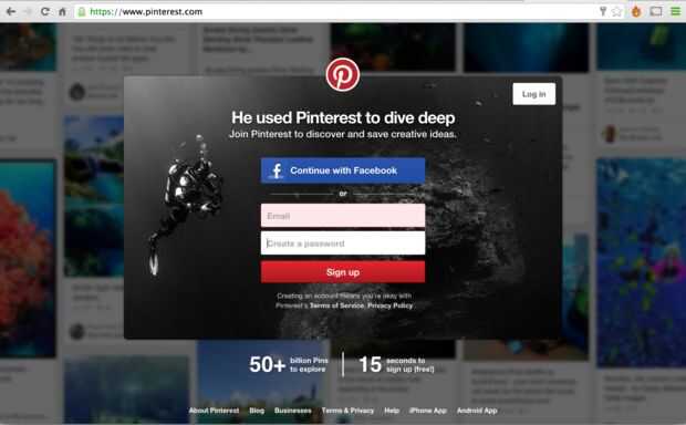 Los usuarios pueden cualquier signo para arriba a través de correo electrónico o a través de Facebook. Inscribirse a través de Facebook permite a los usuarios conectarse con sus amigos para ver lo que están fijando y que están siguiendo.
