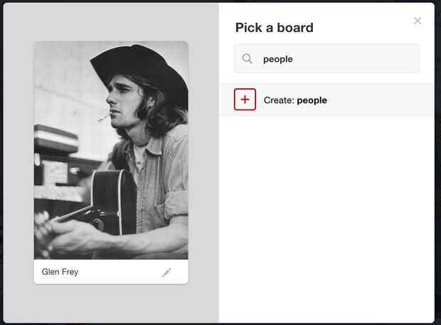 Aparecerá una serie de pantallas. Cargar la imagen desde tu ordenador, añadir una descripción y post a uno de sus tableros. En este caso, creé una nueva placa llamada "personas" para añadir esta imagen de Glen Frey a.