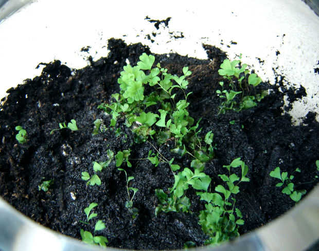Es importante utilizar suelo estéril cuando germinan las esporas.  Usé un recipiente de vidrio con una abertura estrecha por lo que puedo hacer sobre una tapa de plástico para evitar que el suelo se seque.  En el envase que capas de guijarros, algunas activan carbón (ya que el envase no tiene drenaje), entonces el encapsulamiento estéril suelo.  El suelo de agua y rocíe las esporas escasamente sobre la superficie.  Ponga una tapa en el recipiente y mantener en el interior en un lugar donde puede recibir luz indirecta y sobre todo, asegúrese de que la tierra no se deseque.