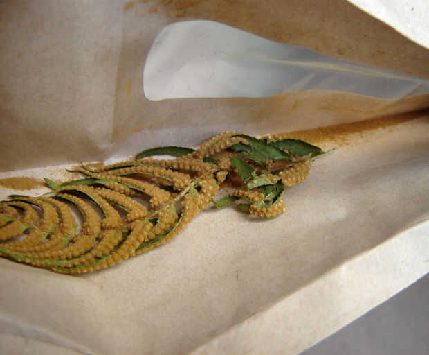 Helechos tienden a producir esporas en el verano.  Tuve la suerte con mi helecho puesto que ya tenía esporas a finales de junio.  Buscar poco marrón-negro protuberancias (sori) en la parte inferior de la hoja (ver imagen 2 + 3 arriba), culantrillo sori aparece hacia el borde de las hojas.  Cuando encuentres una fronda con sori, retire la fronda entera y colóquelo en un sobre de papel y la tienda por un par de días en un lugar seco.  Después de unos días debería haber un fino polvo de esporas de coloreadas marrón en su envoltura.