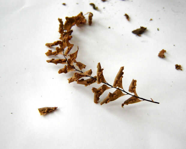 Finalmente acepté que mi pobre helecho pequeño era realmente desaparecido. Cuando fui a limpiar la maceta para hacer espacio para otra cosa, noto pequeñas protuberancias marrones en el envés de las hojas de helechos muertos. Inmediatamente centelleé atrás a mi clase de botánica de la Universidad donde aprendí sobre ciclo de vida de los helechos. Estas pequeñas protuberancias marrones contienen esporangios (esporas), un medio por el cual pueden reproducir helechos. Aunque mi helecho poco se ha ido, pude crear nuevos helechos de sus esporas.