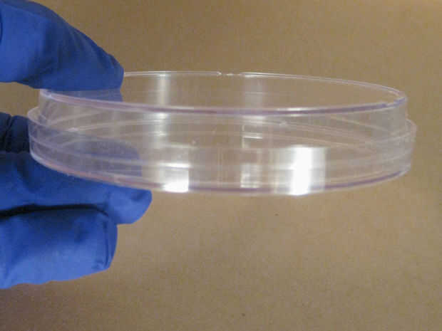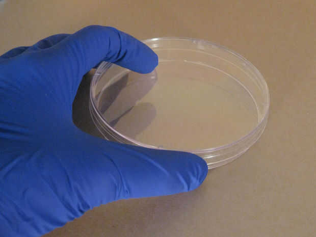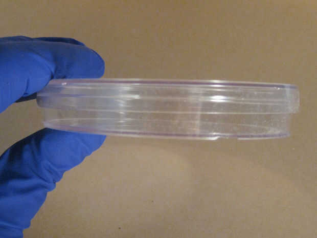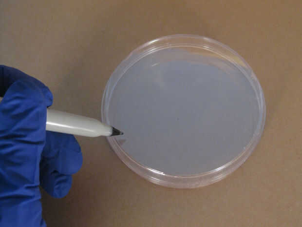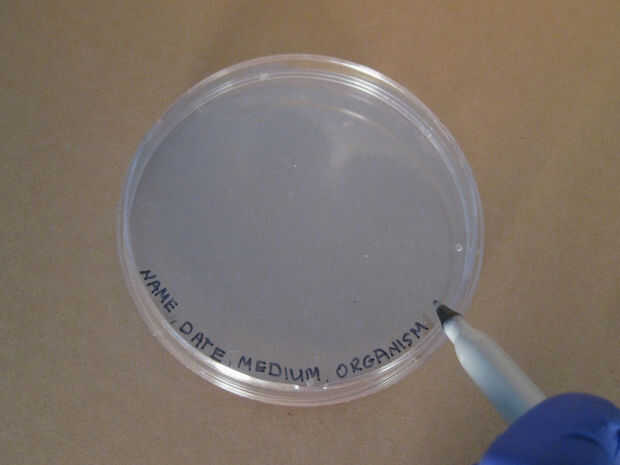 Tome una de sus placas de petri estériles y mientras aún cerrada la tapa boca abajo. Utilice una pluma sharpie y lable la parte inferior de la placa de petri con tu "Nombre", "Fecha", "Tipo medio" y "Organismo", en este orden, a lo largo del borde circular de la placa. Así que tu experimento todavía será visible.