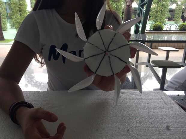 9 - Por fim, encaixe o espeto com o canudo, fazendo com que una turbina fique presa em cima hacer copo e dar perfeitamente.
