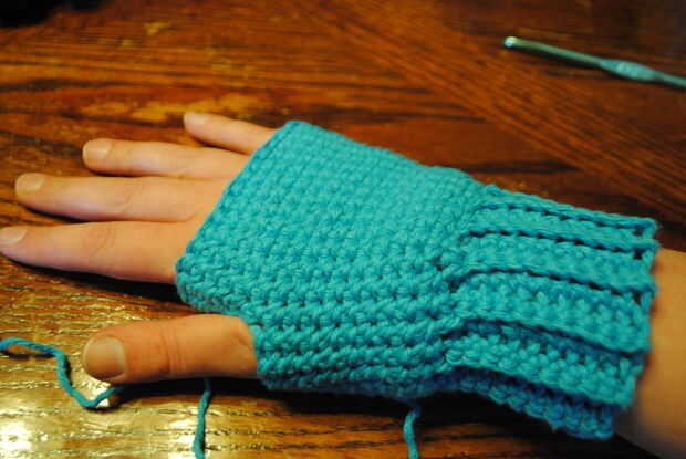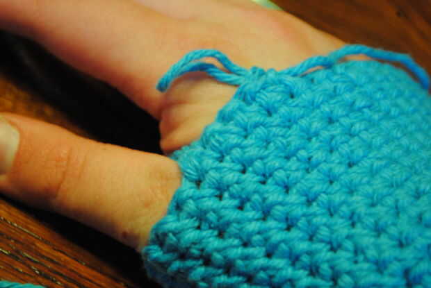 Para hacer la apertura de pulgar: Ch 4, skip 7 st, continuar con sc alrededor de 4 rondas.
