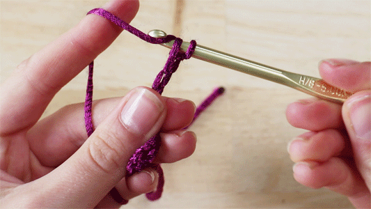 Coger el hilo en su mano izquierda con el gancho y tire de ella a través del primer lazo. Esto te dejará otra vez con dos lazos en el gancho. Coger el hilo otra vez con su gancho y tire de ella a través de ambos lazos. Repita estos pasos hasta llegar al final de la fila encadenado.