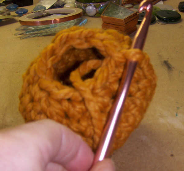 Ronda final: Quitar marcador. Elaborar un lazo en cada uno de los siguiente 2 sts; establecer un lazo y tire a través de 3 lazos en el gancho (dos veces). Tejer en los extremos con ganchillo.