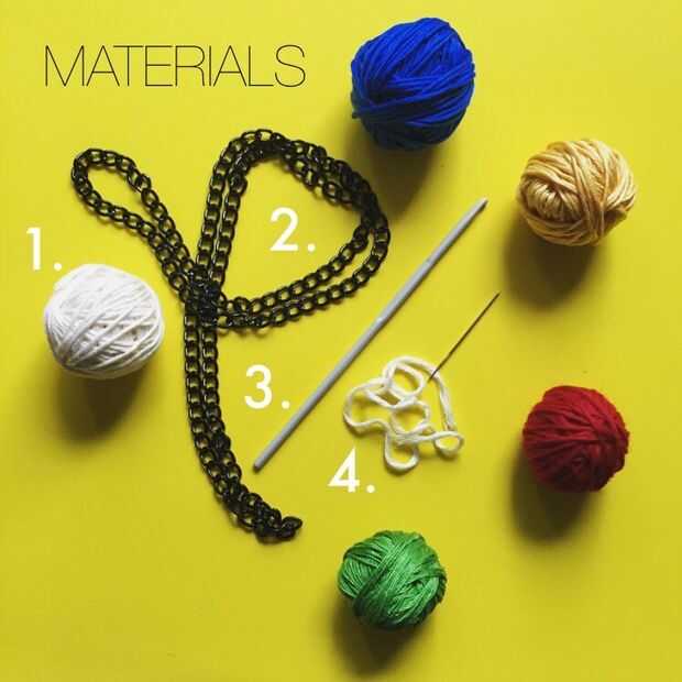 - 5 madejas de DK peso de hilo de algodón (1 azul, 1 amarillo, 1 rojo, 1 verde, 1 blanco apagado). Utilizamos Gotas diseño Muskat (50 g/100 m por bola)