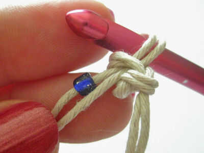 Ahora, antes de hacer la segunda cadeneta, deslice uno de sus granos de la semilla hacia arriba y luego hacer la puntada. Repita este proceso con todas sus puntadas de cadena hasta su brazalete o pulsera para el tobillo es la longitud correcta para usted. No dude en mantener control alrededor del tobillo o muñeca. Usted tendrá que envolver todo el camino sin los extremos tocando - un espacio de 1-2" sería buena (cáñamo se extiende con el tiempo o si se ha mojado, etc., por lo que un poco de espacio extra para ceñir más tarde).