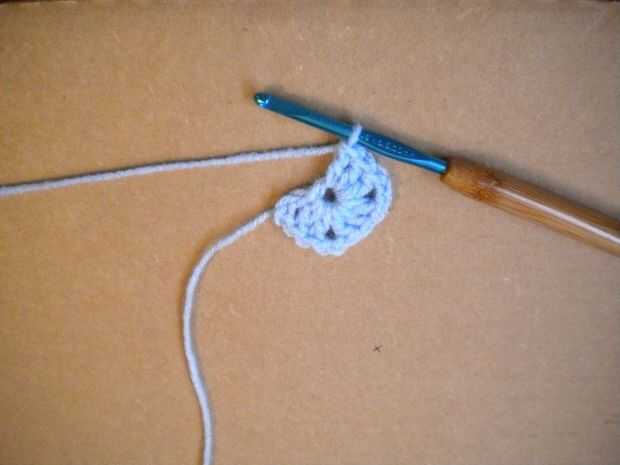 2 cadena nuevo, hacer otra shell haciendo tres ganchillos doble en el anillo (es shell número 3).