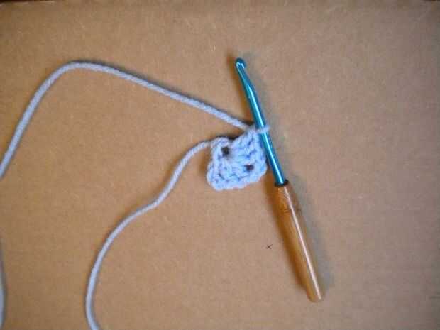 La primera ronda consistirá de cuatro granadas. Usted necesitará 2 puntadas entre cada cáscara en la primera ronda de la cadena.