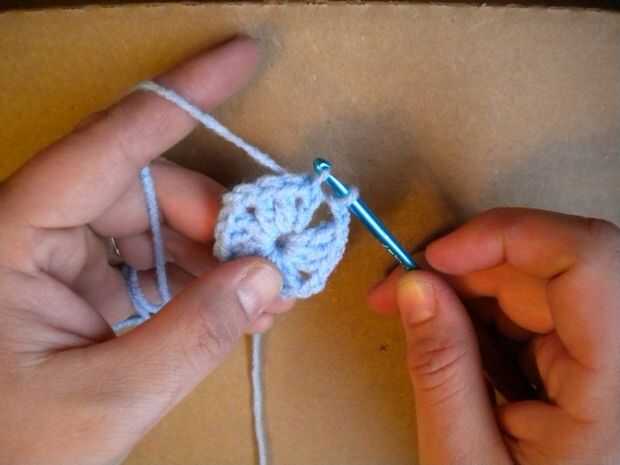 Este conjunto de puntos es el primer "shell" de la Plaza de la abuelita. Una cáscara consiste en tres ganchillos doble juntos en el mismo espacio. Tenga en cuenta que la cadena de 3 ocurre un doble crochet.