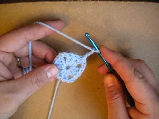 La primera ronda de la Plaza es completa. Para redondo dos start simplemente encadenando tres puntadas hacia arriba.