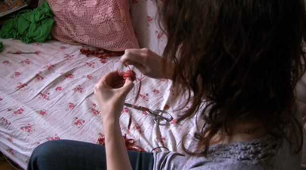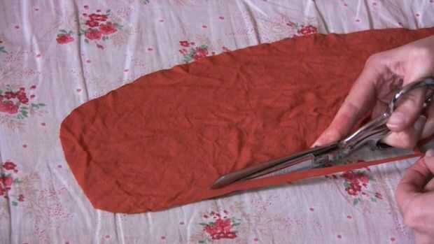 Cortar un gran escote redondo en la camisa. La pieza que se corta por el cuello utilizas para cortar en trozos y cadena.