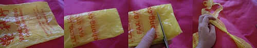 Realizar plarn, doblar una bolsa de plástico y cortar en tiras de alrededor de 1 pulgada de ancho (puede cortar bolsas de espesor un poco más estrecha y finas bolsas un poco más amplias para conseguir una bastante consistente de calibre). Están cortando su bolsa al lado, así que cada tira será realmente un bucle. Pase un lazo a través del lazo anterior y a través de sí mismo para atarlos juntos.