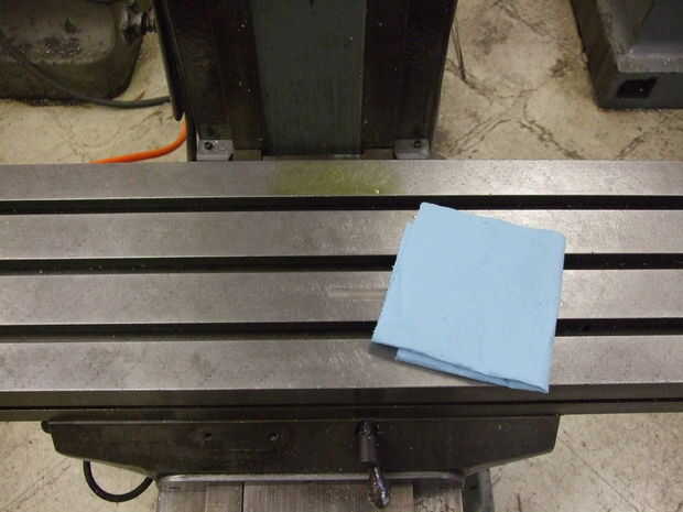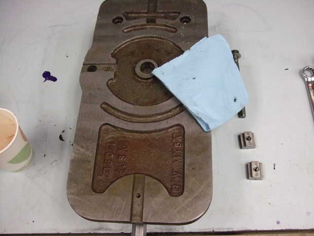 Tomar una toalla y limpiar la cama de la tabla.  Errante va deshacerse de llanura y puede dañar la superficie de la mesa o tornillo de banco.  Si el tornillo va a estar en posición durante mucho tiempo, cubra la mesa con un poco de aceite para evitar la oxidación.  Limpiar la parte inferior de la mordaza con una toalla y coloque el tornillo de Banco sobre la mesa.  Poner tuercas y tornillos de ranura en t en posición, pero dejarlos sueltos.