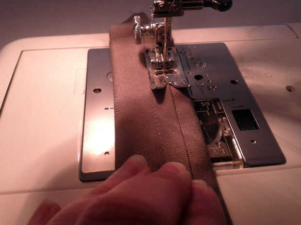 La pieza en la máquina, con el lado abierto de la izquierda y dejando la aguja en la posición la anterior costura con.  Estire a la tela alrededor de la cinta y coser.   De nuevo, utilice la mano para tirar a la tela en lugar de como coser.