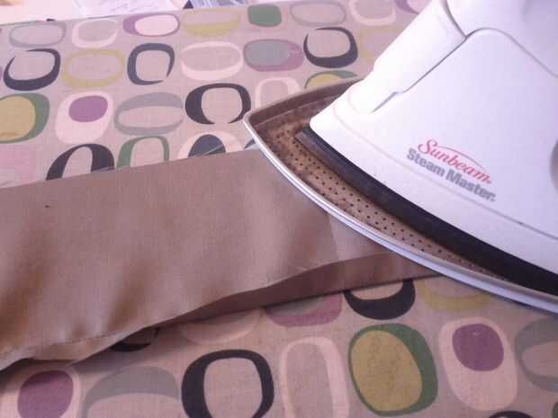 Si la tela tiene impreso y un lado en blanco, hacer este paso con la cara impresa hacia abajo en la tabla de planchar. Si cosió dos trozos de tela para cubrir su correa con, asegúrese de que el lado áspero - el lado de la tela con los márgenes - también es hacia arriba.