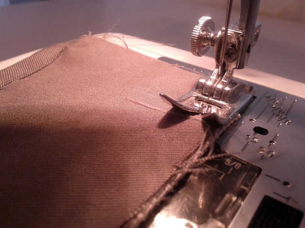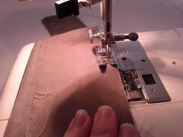 Utilizando otra puntada recta en la posición izquierda, coser a la tela a la cinta.  Usa tu mano para alinear los bordes de la tela mientras se trabaja.