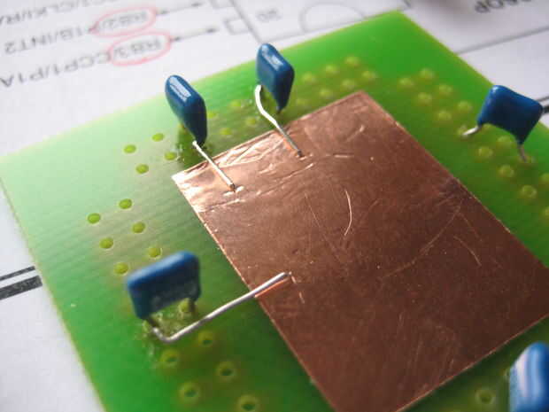 Luego necesitas meter las patas del condensador a través de la Junta del adaptador con una pierna del condensador a través de la alimentación positiva (a ser desconectados) agujero y la otra pierna colocan a través de la conexión del pin de tierra. Esto es bastante fácil con los PIC18F desde el poder y las conexiones a masa están generalmente cercanas.