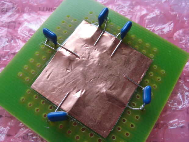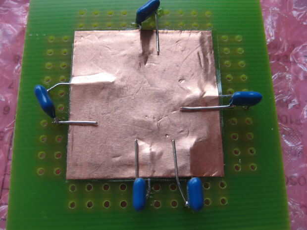 a continuación necesita tomar más solo alambre y soldar un extremo al lado positivo del condensador de desacople y el otro debe ser formado que sea sobre la cinta de cobre. Esta cinta de cobre debe ser nuestro positivo 'plano de la energía'.