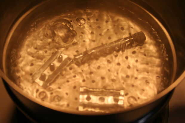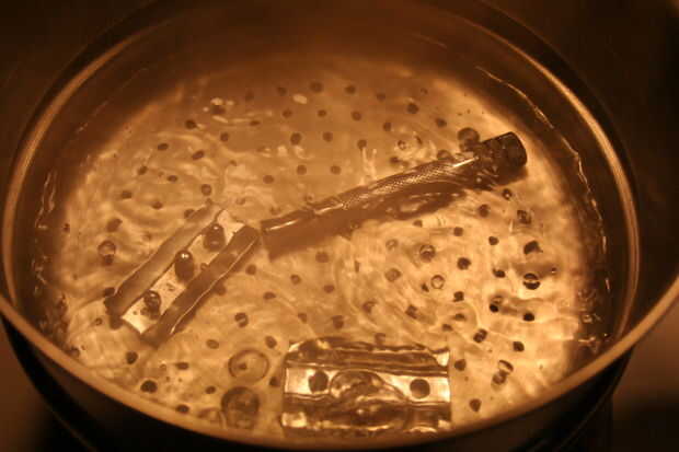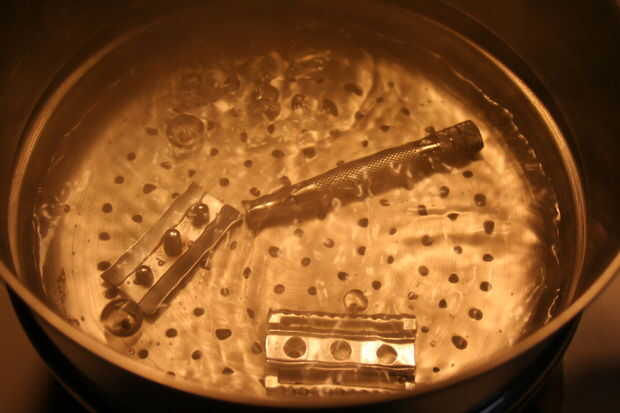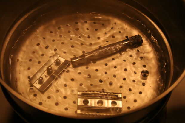 Poner el agua a hervir. Hervir la maquinilla de afeitar de seguridad de un 25-30 minutos. Mientras que esto va a obtener su brocha de tejón y se preparan para limpiar.