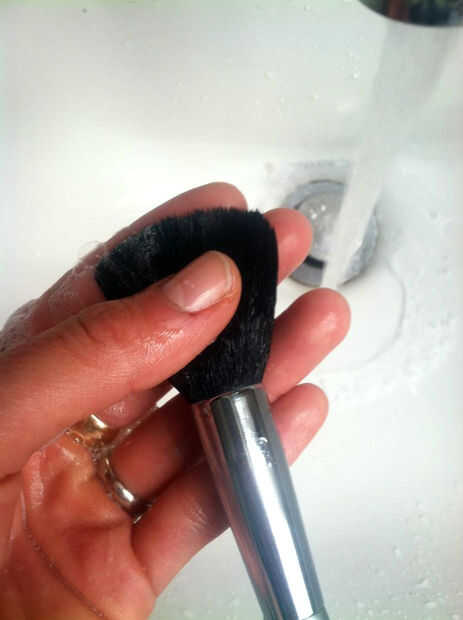 No es necesario saturar tus pinceles fuertemente con agua y jabón. Derramar un poco de jabón en la palma, frote el cepillo en el jabón y utilice sus dedos para limpiar suavemente las cerdas con un movimiento de pellizco, desde la base hasta las puntas del cepillo.